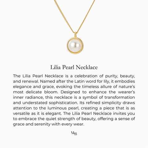 The Lilia Pearl Necklace is a delicate and timeless piece that celebrates purity, beauty, and renewal. Named after the Latin word for lily, it embodies elegance and grace, evoking the timeless allure of nature’s most delicate bloom. Suspended from a sleek satellite-style chain, its minimal and refined design ensures that the luminous pearl remains the focal point. The pearl is embedded in a sterling silver frame with a flat back, allowing it to sit beautifully against the wearer’s chest. Crafted from sterling silver and plated in 18k gold, the necklace offers a radiant finish that enhances its elegant appeal.