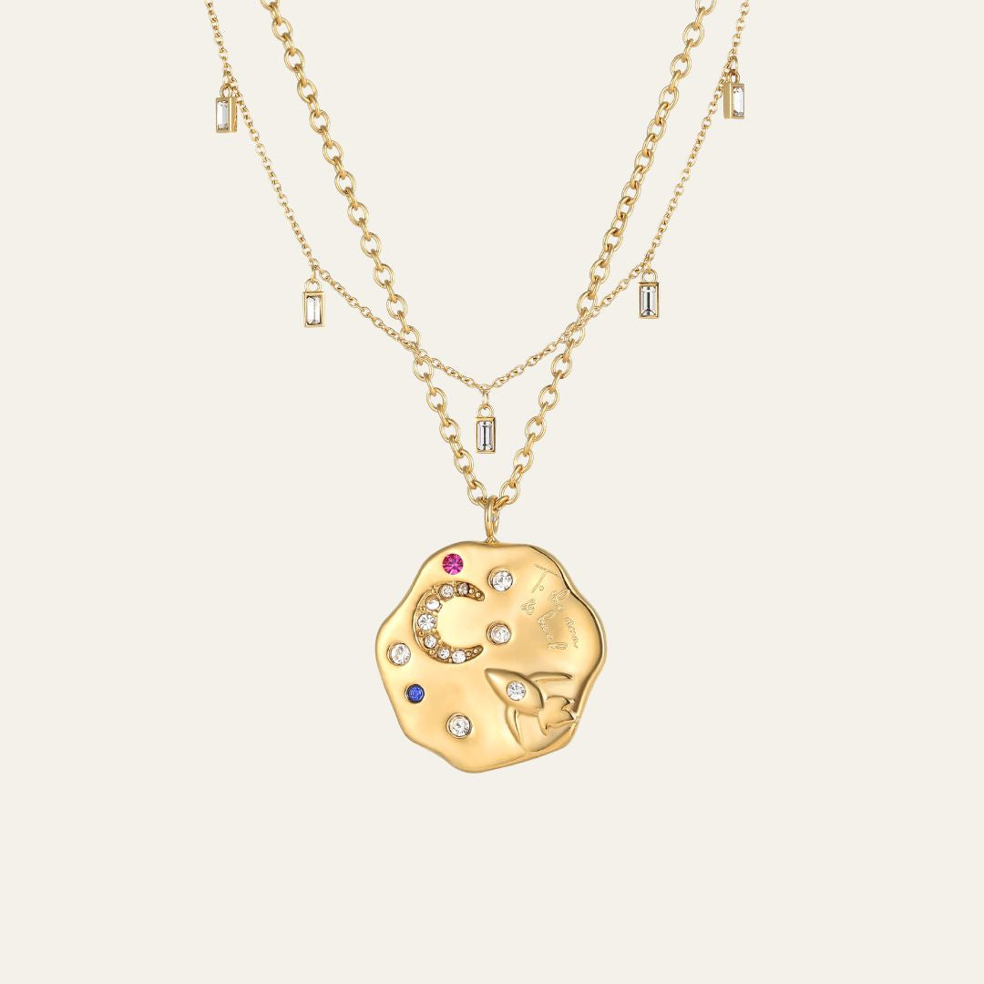 The To The Moon & Back Necklace features our signature jagged edge pendant, with a rocket in motion soaring toward a shimmering crescent moon adorned with delicate zirconia stones and surrounded by twinkling stars. Engraved with the intentionally subtle message To the Moon & Back, it’s a quiet reminder that no matter where life takes you, someone would go to the ends of the earth for you.