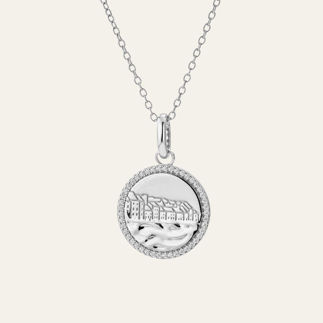The pendant features a rippled texture, echoing the gentle waves of the River Corrib as they lap against Spanish Arch. It’s a subtle yet striking tribute to the place where the colourful houses meet the water - a scene etched into the hearts of locals and visitors alike.