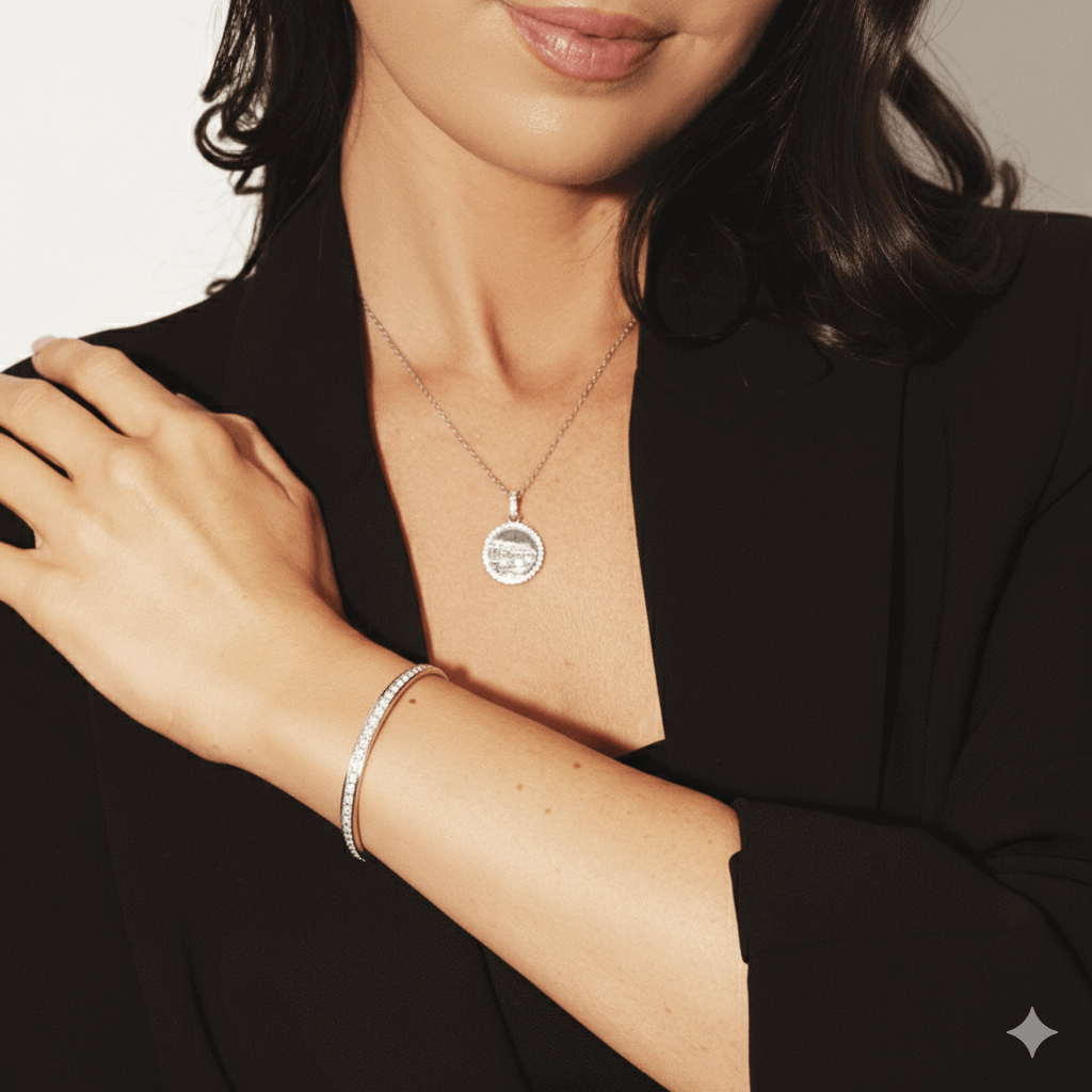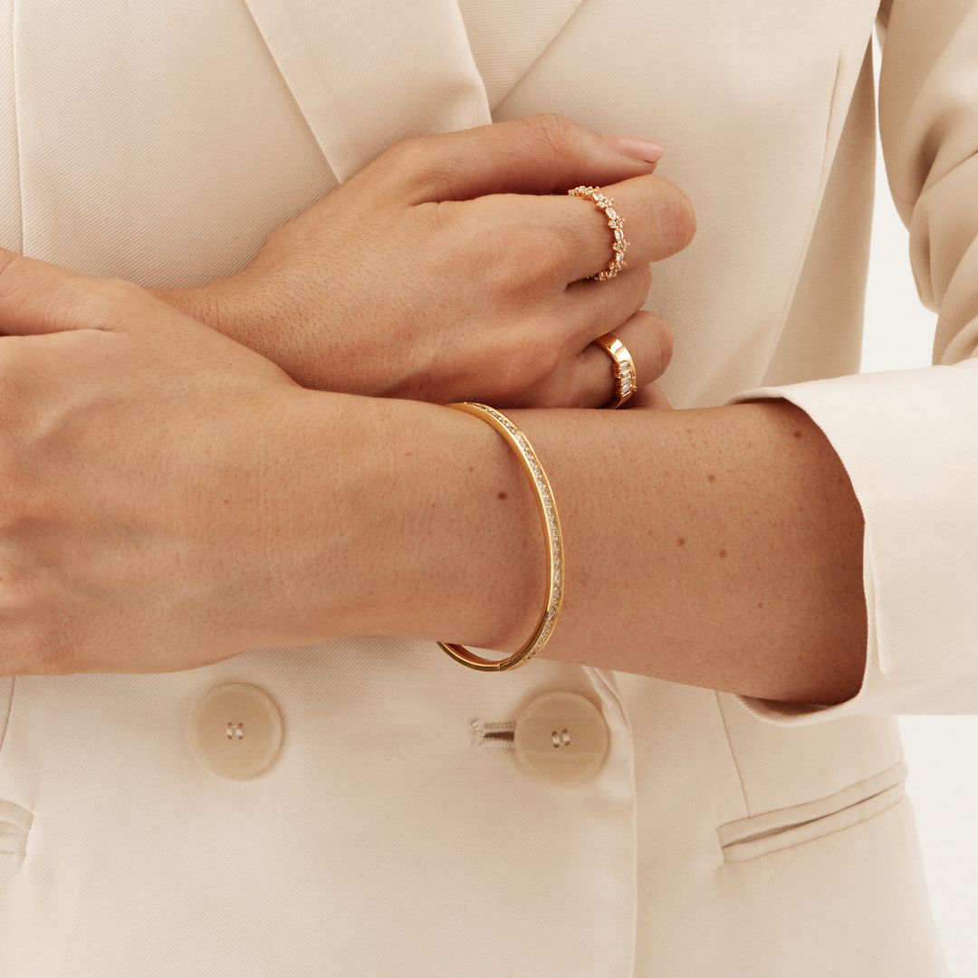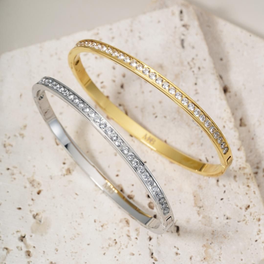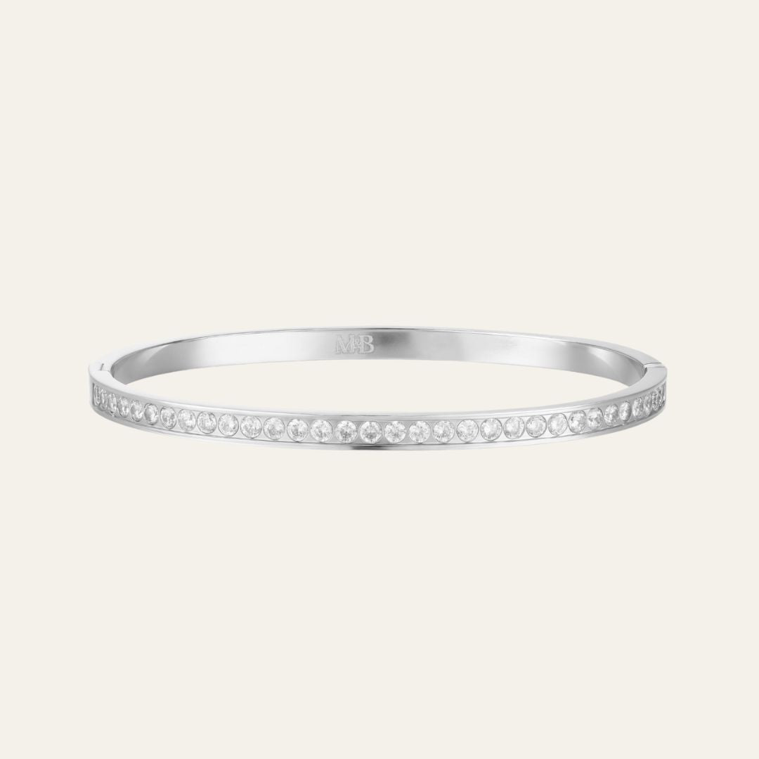 The Embellished Bangle is a modern classic designed to elevate your everyday style. Crafted from durable stainless steel, it features a sleek, water resistant, polished band adorned with a single line of sparkling white stones along one side, adding just the right amount of brilliance. The bangle clicks securely closed for ease and comfort, making it the perfect piece for layering or wearing solo.