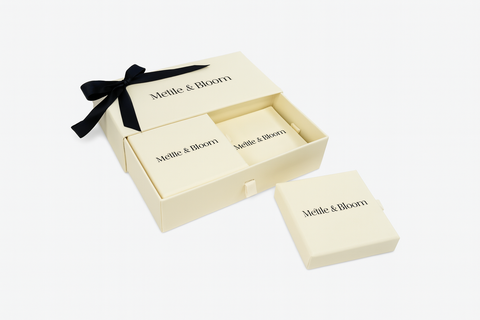 Elevate your gifting with our personalised branded gift box, thoughtfully designed to hold up to four jewellery pieces. The box includes a beautiful black bow - perfect for gifting.